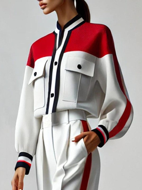 Be the first to review “Urban Color Block Stand Collar Pockets Jacket White-red | Women Jackets”